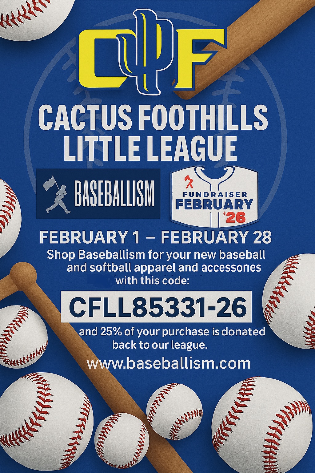 This February, Cactus Foothills Little League is partnering with Baseballism.com for a special fundraiser! When you shop through our fundraiser link, a portion of every purchase goes directly back to supporting our league—helping fund equipment, fields, uniforms, and player development programs.